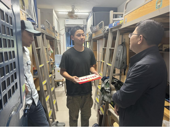 彭欣健深入宿舍与同学阐述本次评选标兵宿舍及入党积极分子宿舍的意义,并对同学们提出两点期望:一是希望同学们能够以此荣誉称号作为前进的动力,保持好宿舍卫生,营造良好的学习生活氛围;二是希望同学们能够把参与标兵宿舍及入党积极分子宿舍共建的氛围影响到更多的学生宿舍,强化自身责任与担当,发挥好模范引领作用,以实际行动,带动全院学生形成良好的行为规范。