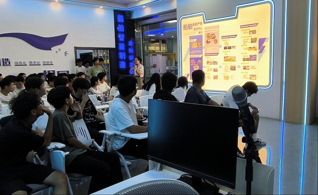 讲座结束后,新生们在专业教师带领下,有序前往学院实训平台进行“零距离”参观。在船舶智能产线、豪华邮轮与虚拟装配实训室、焊接实训中心、轮机实训中心及船舶结构实训室等场所,同学们通过现场讲解与实地观摩,对先进的设施设备和未来的实践教学内容有了直观认识。各班级实行错时参观,流程衔接流畅,确保了每位同学都能沉浸式体验学院优质的实训资源。