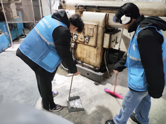 清扫过程中,志愿者们分工明确、默契配合。大家手持扫帚拖把清扫地面,不放过卫生死角。面对油污、顽固灰尘等难点,大家相互支招、合力解决,不怕脏累,用双手为实训室 焕新颜,充分展现了新时代青年吃苦耐劳、团结协作的良好风貌。