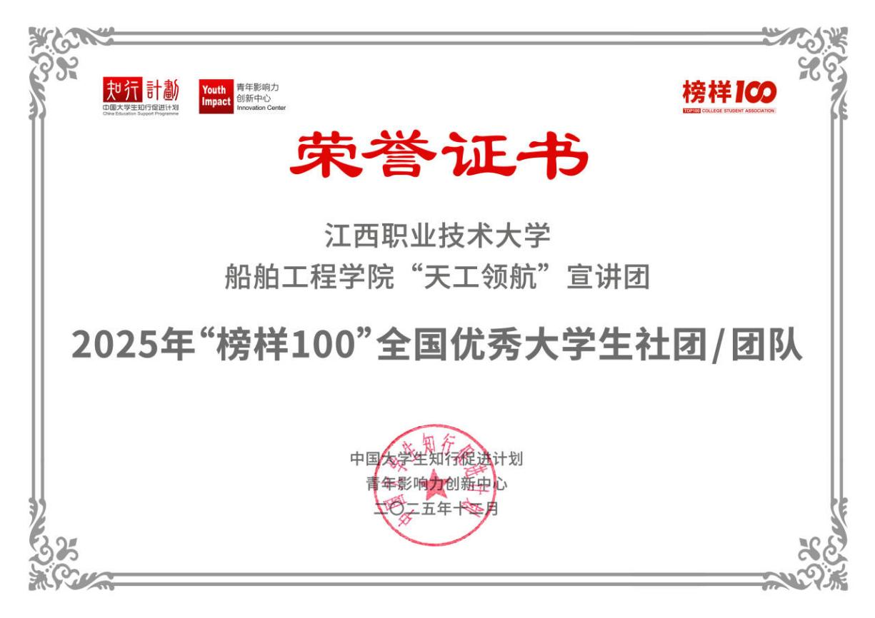 本网讯(船舶工程学院)近日,2025年度中国大学生知行促进计划“榜样100”全国优秀大学生社团/团队榜单正式揭晓。船舶工程学院“天工领航”宣讲团凭借其在宣讲和志愿服务领域的长期坚守获得显著成效,从全国376所高校的数千支团队中脱颖而出,成功跻身“榜样100”大学生优秀案例榜单,荣获2025年“榜样100”全国优秀大学生团队。这一荣誉不仅是对团队公益实践的高度认可,也为我校实践育人工作添上了浓墨重彩的一笔。